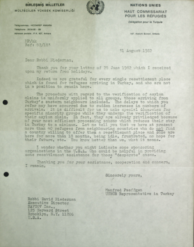 1982 Letter from UNHCR Representative in Turkey Manfred Paeffgen to Rabbi Niederman discussing UNHCR Refugee operations in Turkey.